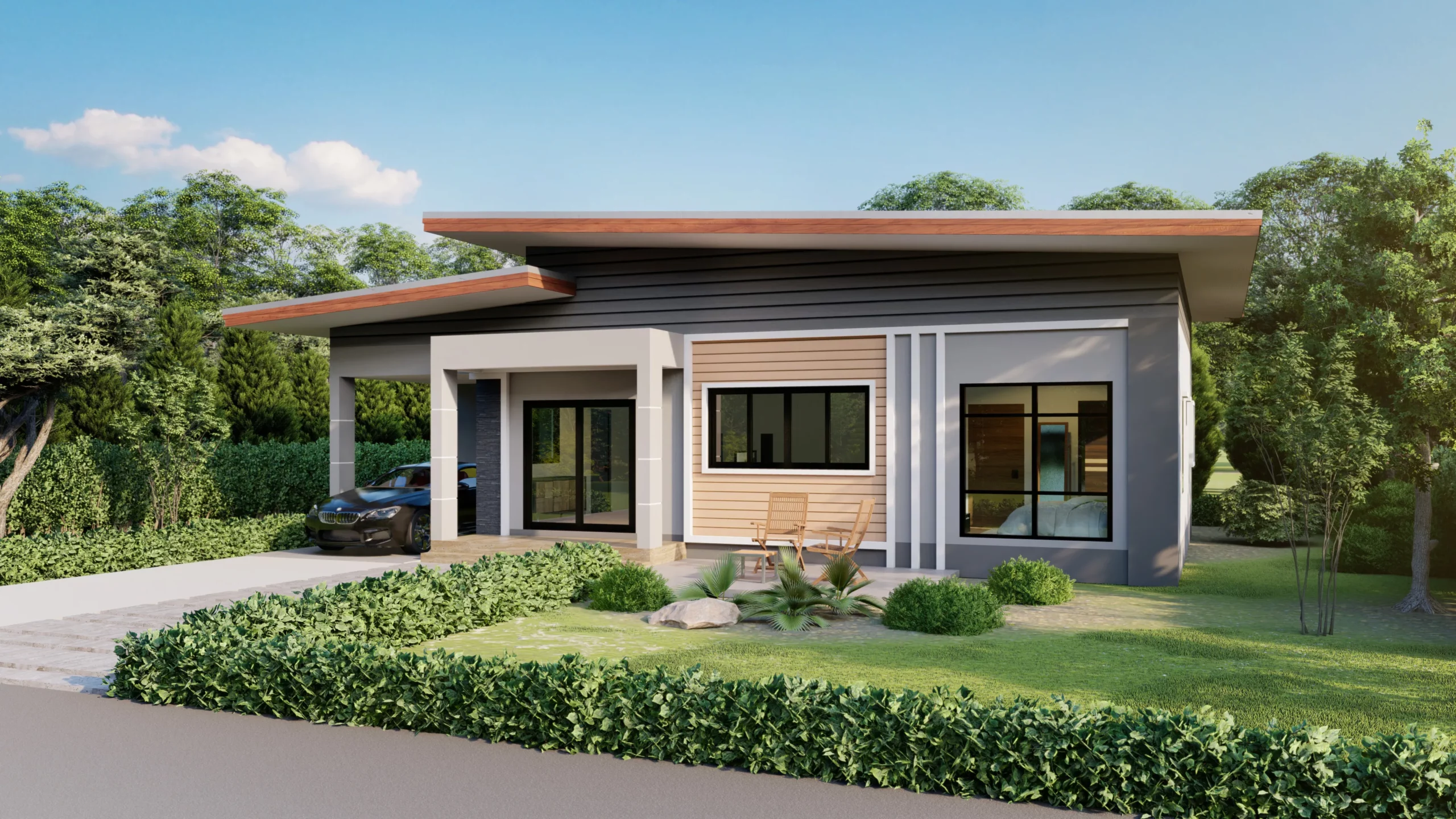 บ้านชั้นเดียวสไตล์ Modern ออกแบบด้วยเส้นสายเรียบง่ายและรูปทรงเรขาคณิต เน้นความโปร่งโล่งด้วยประตูกระจกและหน้าต่างบานใหญ่ เปิดรับแสงธรรมชาติและเชื่อมต่อกับสวนภายนอกอย่างกลมกลืน วัสดุที่ใช้มีความทันสมัย เช่น ปูนเปลือย ไม้ และกระจก ผังบ้านเน้นการใช้พื้นที่คุ้มค่า จัดสรรฟังก์ชันให้สะดวกต่อการใช้ชีวิตประจำวัน
